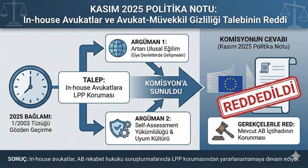 Son dönemde, rekabet hukuku soruşturmaları kapsamında şirket içi hukuk müşavirlerinin (in-house counsel) yazışmalarına ilişkin “avukat-müvekkil gizliliği” (legal professional privilege, LPP) kapsamında koruma talebi yeniden gündeme geldi. AB 1/2003 sayılı Tüzüğü’nün yeniden incelenmesinde kamuoyu görüşüne başvurulunca, bazı paydaşlar bunu avukat-müvekkil gizliliği kapsamının şirket içi hukuk müşavirlerine de uzanması gerektiğini ileri sürmüştü. 10 Kasım 2025’te Avrupa Komisyonu, bu konuda yayımladığı politika notuyla (Competition Policy Brief[1]) bazı üye devletlerin beklentilerinin aksine, avukat-müvekkil gizliliğinin yalnızca bağımsız, üye devlet barosuna kayıtlı şirket dışı avukatları kapsadığına ilişkin görüşünü paylaştı. Böylece Komisyon, rekabet soruşturmalarında avukat müvekkil gizliliği kapsamının şirketlerin hukuk müşavirlerini de kapsayacak şekilde genişletilip genişletilmeyeceğine dair tartışmaya bir yanıt vermiş oldu.
