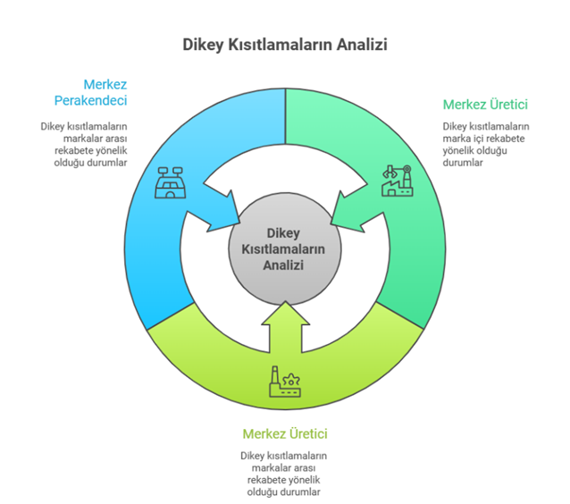 - Merkez üretici, dikey kısıtlama markalar arası rekabete yönelikse: Klein’a göre bu senaryoda iktisadi dinamikler değişiyor. Üreticinin, perakendeciler üzerinden rakiplerine yönelik bir kısıtlama getirmesinin etkinlik yaratmasa dahi kârını artırabileceğine; piyasa gücünü korumasına ya da artırmasına hizmet edebileceğine dikkat çekiyor. Öte yandan belirleyici olan husus yine, perakendecilerin teker teker merkezdeki üreticinin talebine uymasının mümkün olup olmadığı olarak karşımıza çıkıyor